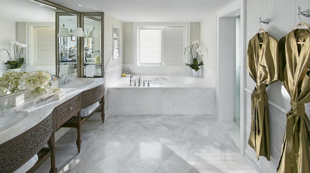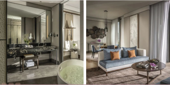 此外還設有起居室、用餐室和露臺,大理石浴室配備步入式淋浴和步入式衣櫥,寬敞完善的功能區(qū)使客人有居家的親切感。