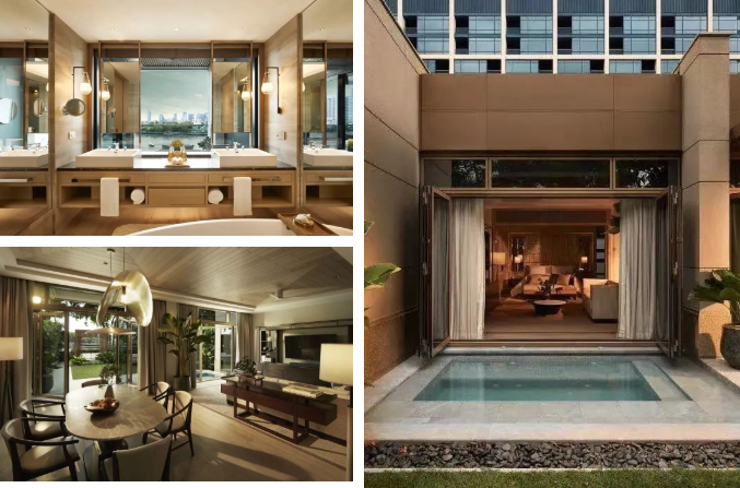 建筑、庭院、露臺和水榭打破了室內與室外的空間感,讓住客盡情享受城中度假的自在氛圍。步入酒店,精致的庭院配備植物,直接將幾何排布的水上步道串聯(lián)在一起,形成獨特的自然景觀。